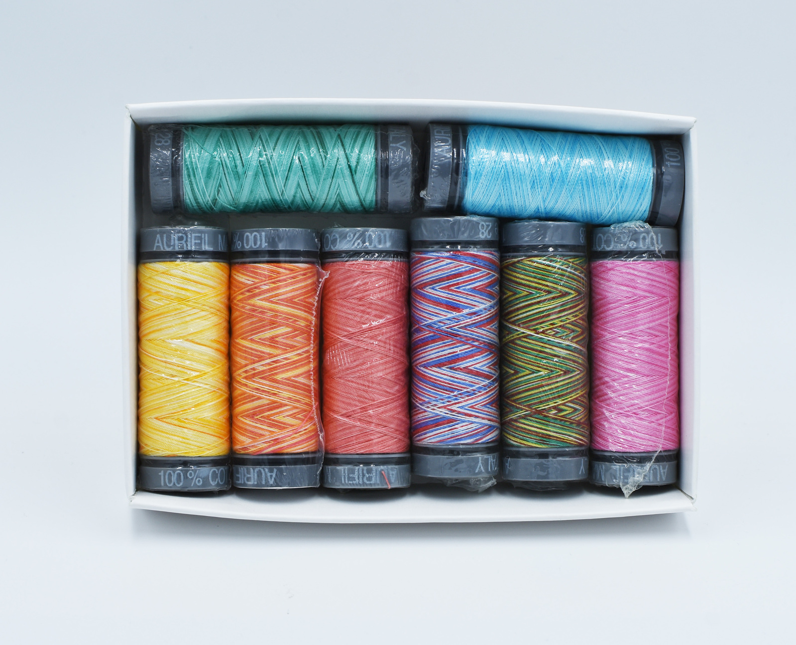 8 x Small Spools (100m) of Aurifil 28wt thread in a cohesive range of variegated colours, packaged in a handy box for easy storage.