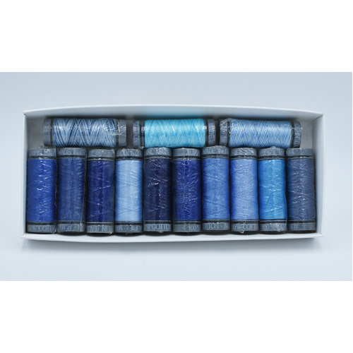 13 x Small Spools (100m) of Aurifil 28wt thread in a cohesive range of blues, packaged in a handy box for easy storage.