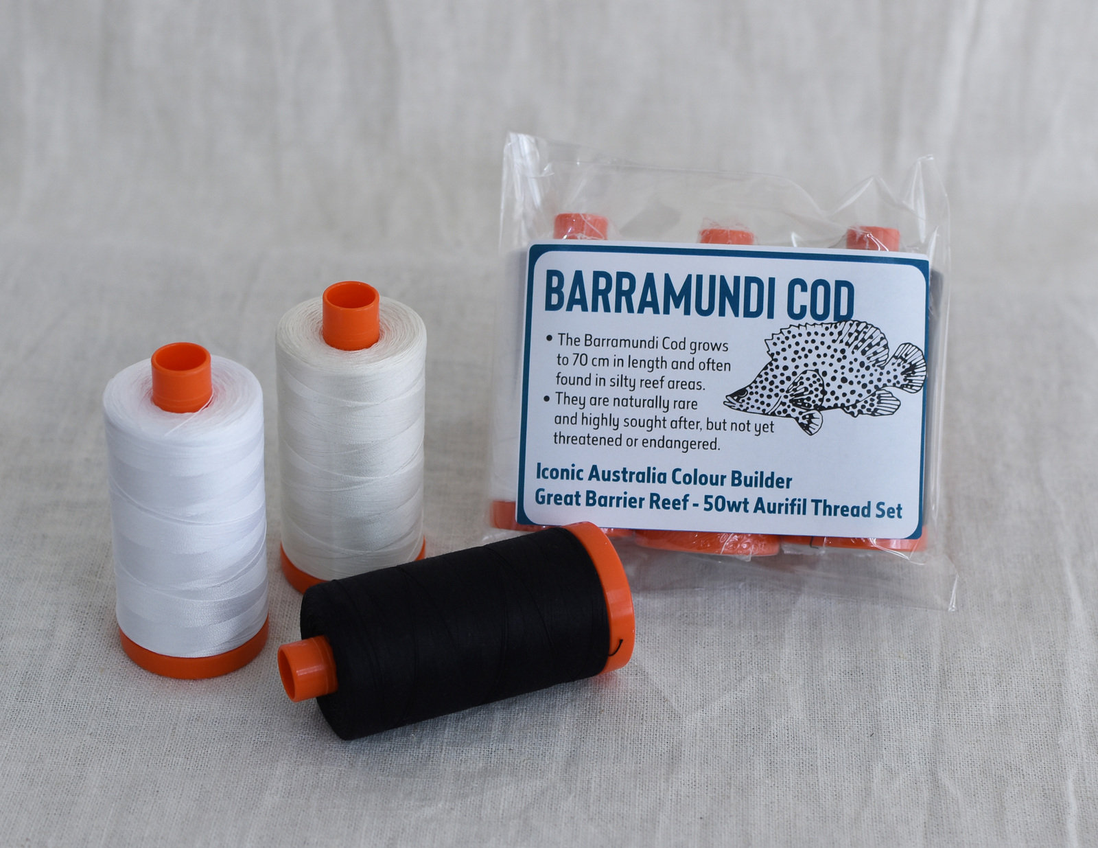 5. Iconic Australia Aurifil Thread Set - Great Barrier Reef 50wt Large - Black & White - Barramundi Cod